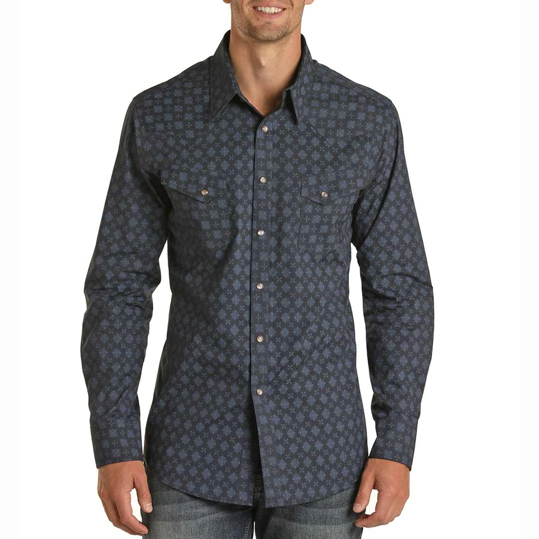 This snap shirt from Rock & Roll Cowboy features a medallion pattern print with a pointed yokes, two snap flap pockets and pearl snap closure.